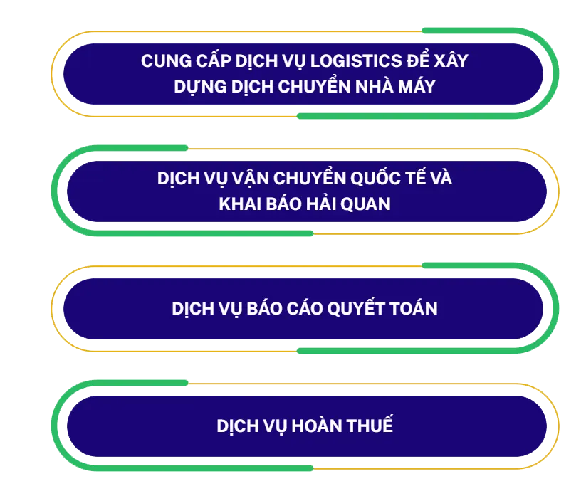 Chúng tôi cung cấp bộ giải pháp logistics cho các nhà máy gia công, sản xuất – xuất khẩu, chế xuất, bao gồm: